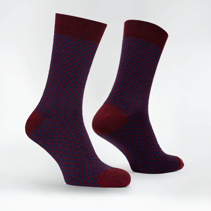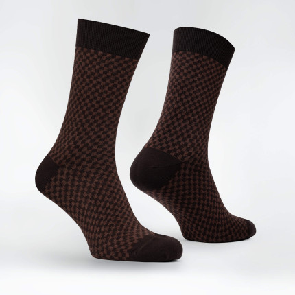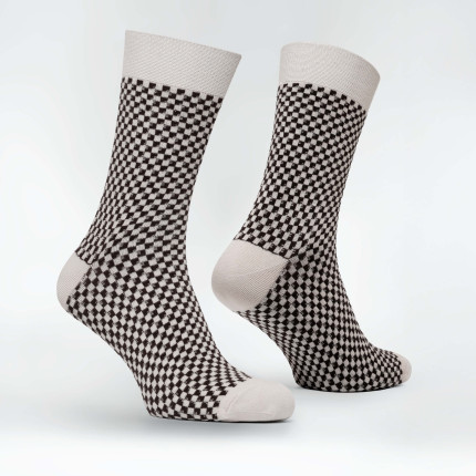 Męskie skarpety żakardowe w wzór szachownicy to stylowy wybór dla osób ceniących połączenie klasyki z indywidualnością. Misterny splot tworzy wyraźny geometryczny wzór, który dodaje stylizacji dynamiki i nowoczesnego uroku.