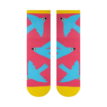 Kolorowe damskie skarpetki z różowym tłem i niebieskimi ptaszkami to połączenie delikatności, radości i stylu. Miękki różowy kolor nadaje im kobiecego uroku, a wzór błękitnych ptaków dodaje lekkości i pozytywnego nastroju. Skarpetki wykonane są z przyjemnej w dotyku bawełny z dodatkiem elastanu, dzięki czemu dobrze się rozciągają, oddychają i zachowują kształt nawet po wielu praniach. Elastyczny ściągacz zapewnia wygodne dopasowanie bez ucisku, a miękka tkanina gwarantuje komfort przez cały dzień. To idealny akcent w codziennym stylu – doskonały zarówno do noszenia na co dzień, jak i jako prezent dla osób, które kochają modne detale z charakterem.