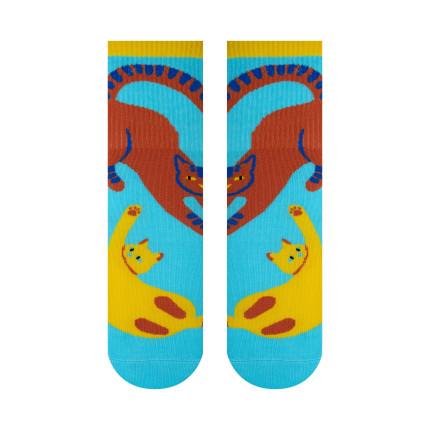 Kolorowe damskie skarpetki z uroczym wzorem „Dwa koty” to stylowy i zabawny akcent w Twojej stylizacji. Główny kolor skarpetek może być delikatny lub intensywny, a dwa małe kotki nadają im oryginalności i pozytywnego charakteru. Wykonane z miękkiej bawełny z dodatkiem elastanu, skarpetki zapewniają komfort, elastyczność i trwałość nawet po wielu praniach. Elastyczny ściągacz pewnie utrzymuje skarpetki na nodze, nie uciskając jej, a przyjemna w dotyku tkanina gwarantuje wygodę przez cały dzień. Idealne do codziennego noszenia, relaksu w domu lub jako uroczy prezent dla osób, które cenią oryginalne i kolorowe detale.